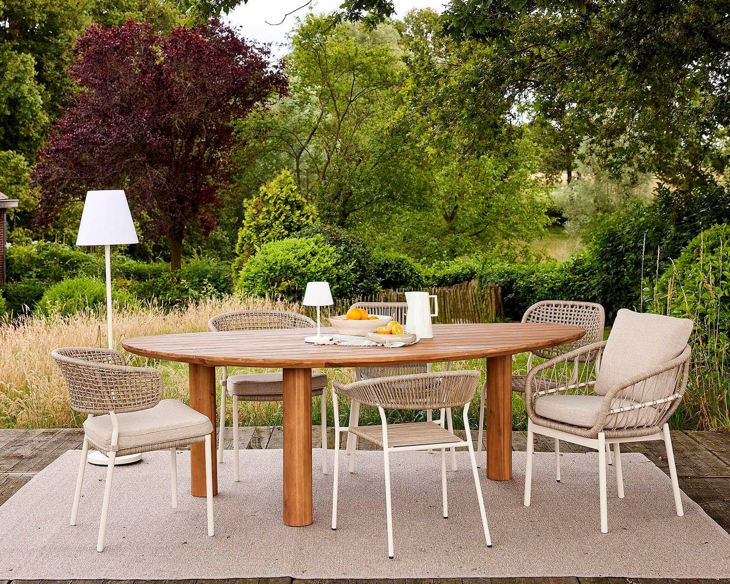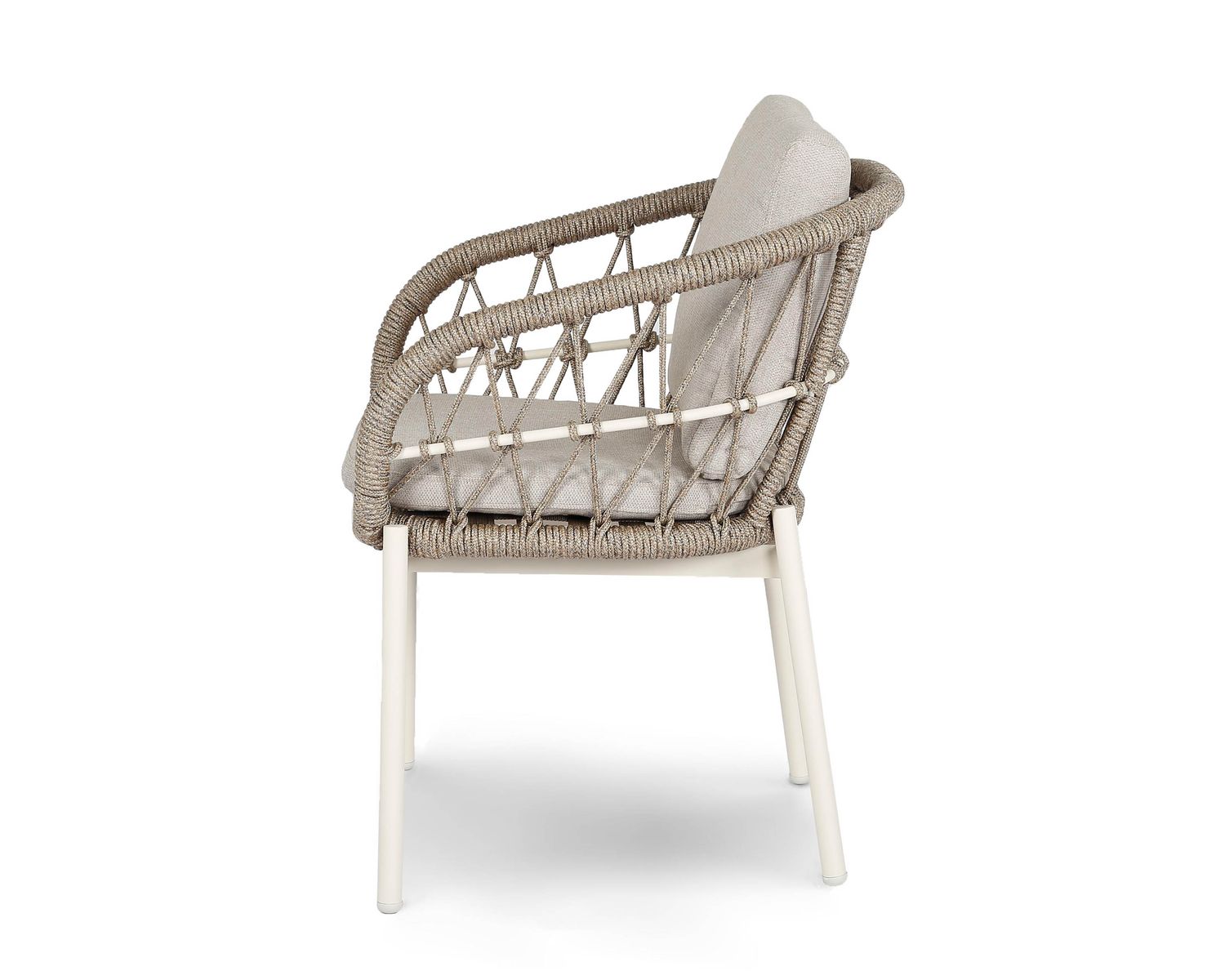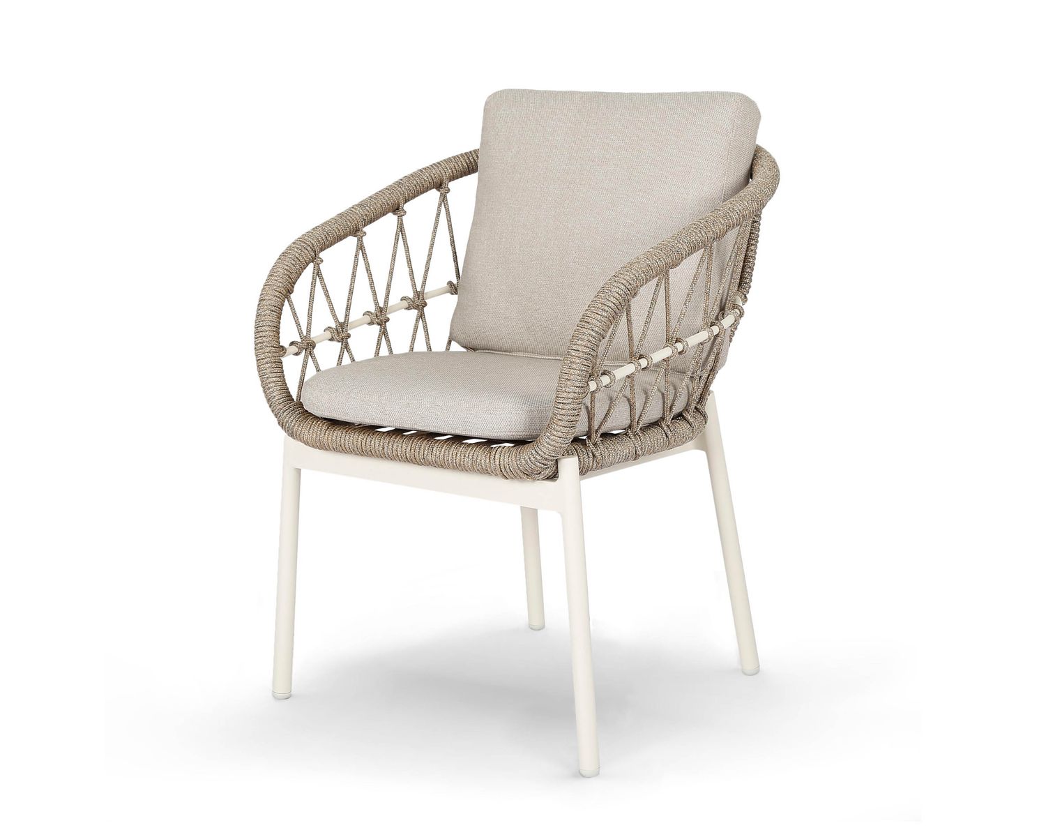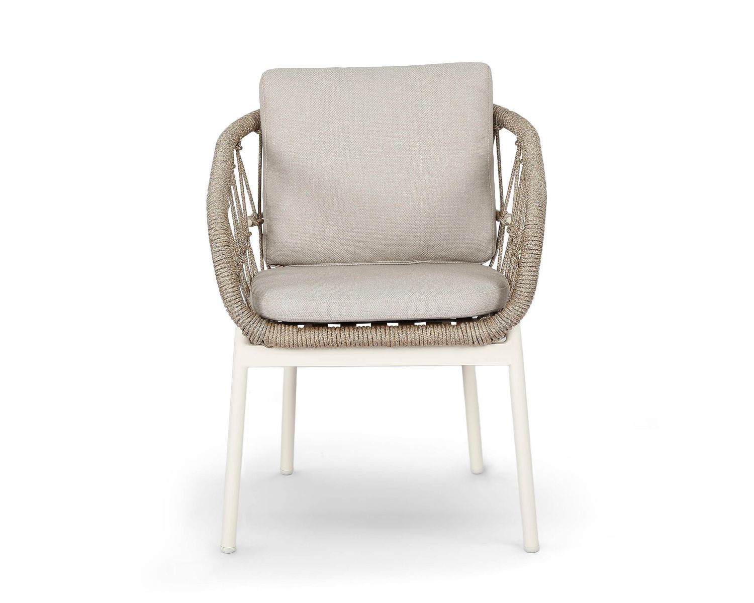 Das strapazierfähige Aluminiumgestell sowie die stilvolle Sitzfläche und Rückenlehne aus Seilgeflecht garantieren dabei Langlebigkeit und Stil. Die passenden Kissen sorgen für noch mehr Komfort und machen diesen Stuhl ideal für gemütliche Mahlzeiten – und um den Look Ihrer Terrasse oder Ihres Gartens aufzupeppen.
