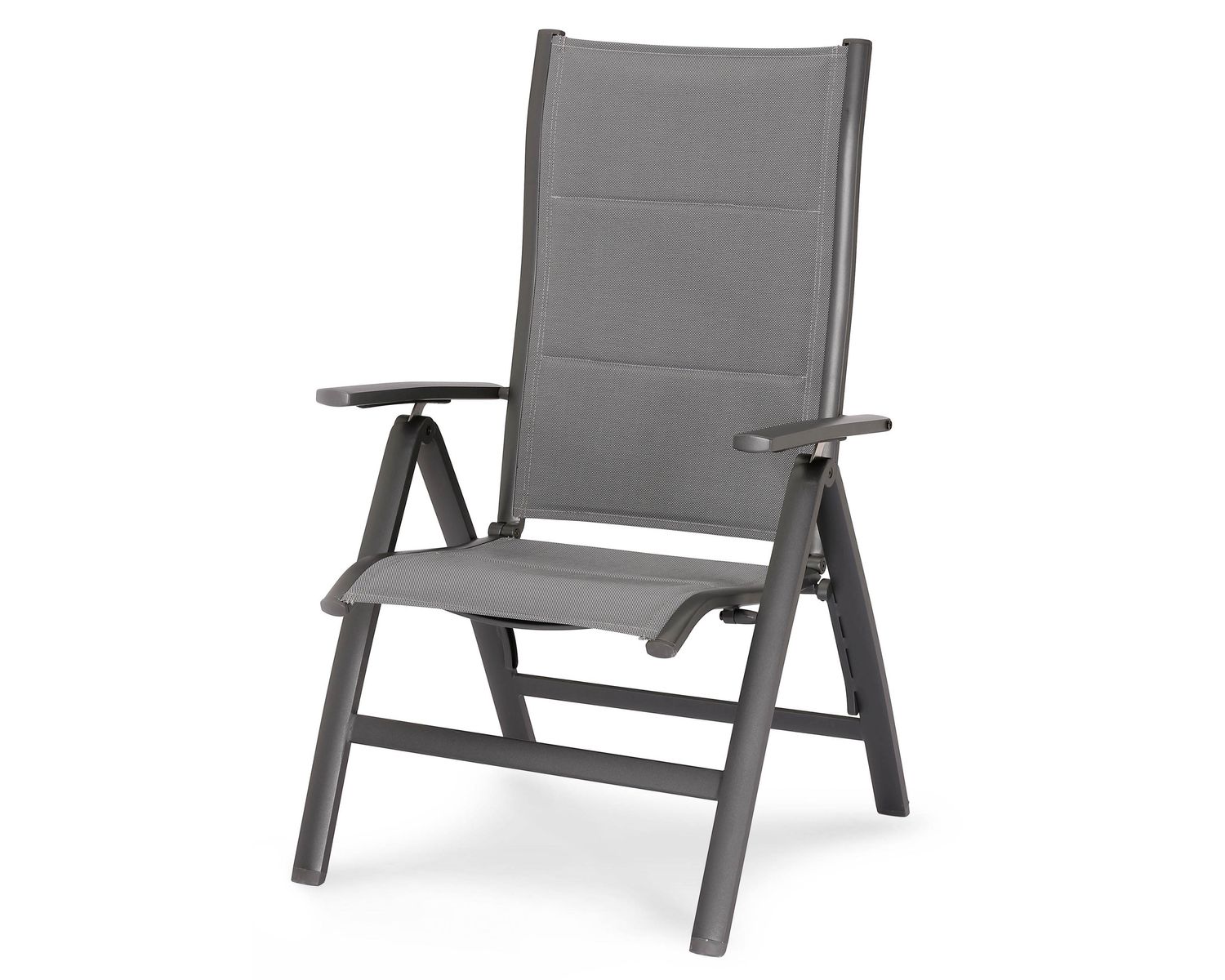 Die Bespannung ist aus strapazierfähigem, reißfestem und witterungsbeständigem Textilene-Gewebe. Sitzfläche und Rückenlehne sind doppelt bespannt und gepolstert, was in Kombination mit der hohen, ergonomisch geformten Rückenlehne für angenehmen Sitzkomfort sorgt. Der Klappstuhl ist sehr stabil und bis zu 150 kg belastbar. Die Rückenlehne ist mehrfach verstellbar.