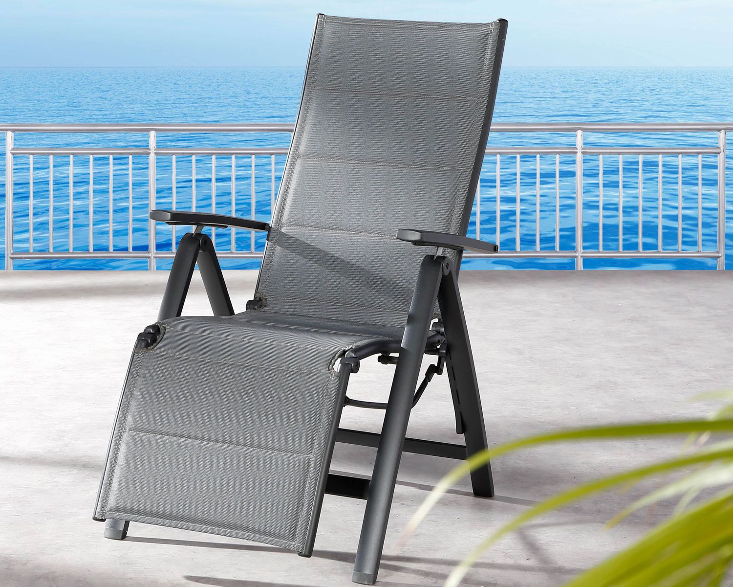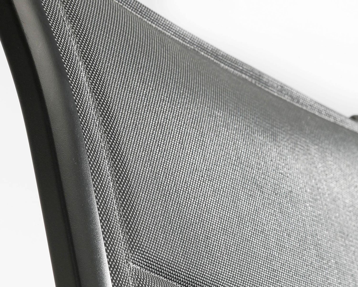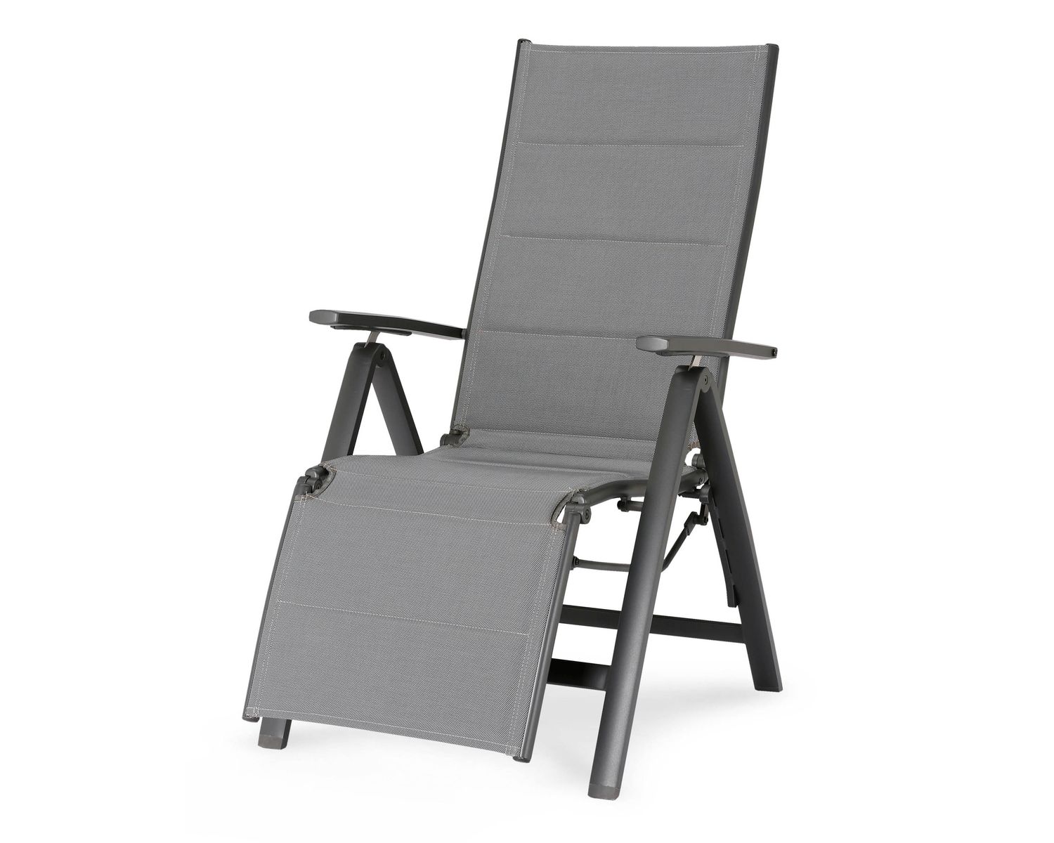 Die Bespannung ist aus strapazierfähigem, reißfestem und witterungsbeständigem Textilene-Gewebe. Sitzfläche und Rückenlehne sind doppelt bespannt und gepolstert, was in Kombination mit der hohen, ergonomisch geformten Rückenlehne für angenehmen Sitzkomfort sorgt. Die Rückenlehne ist mehrfach verstellbar.
