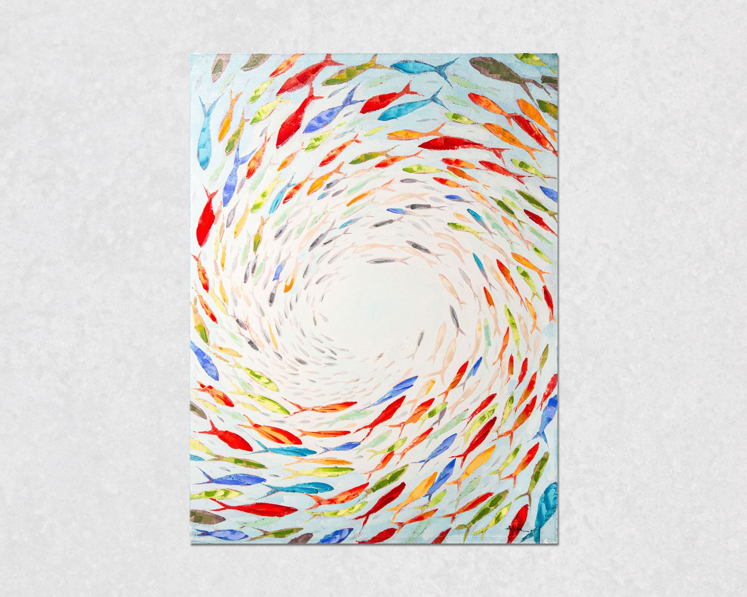 Abstrakte Fische sind in einem immer tiefer gehenden Strudel angeordnet, der von der Farbvielfalt der vielen Fische begleitet wird. Dieses beeindruckende Gemälde im modernen Stil ist ein Ölgemälde-Unikat.