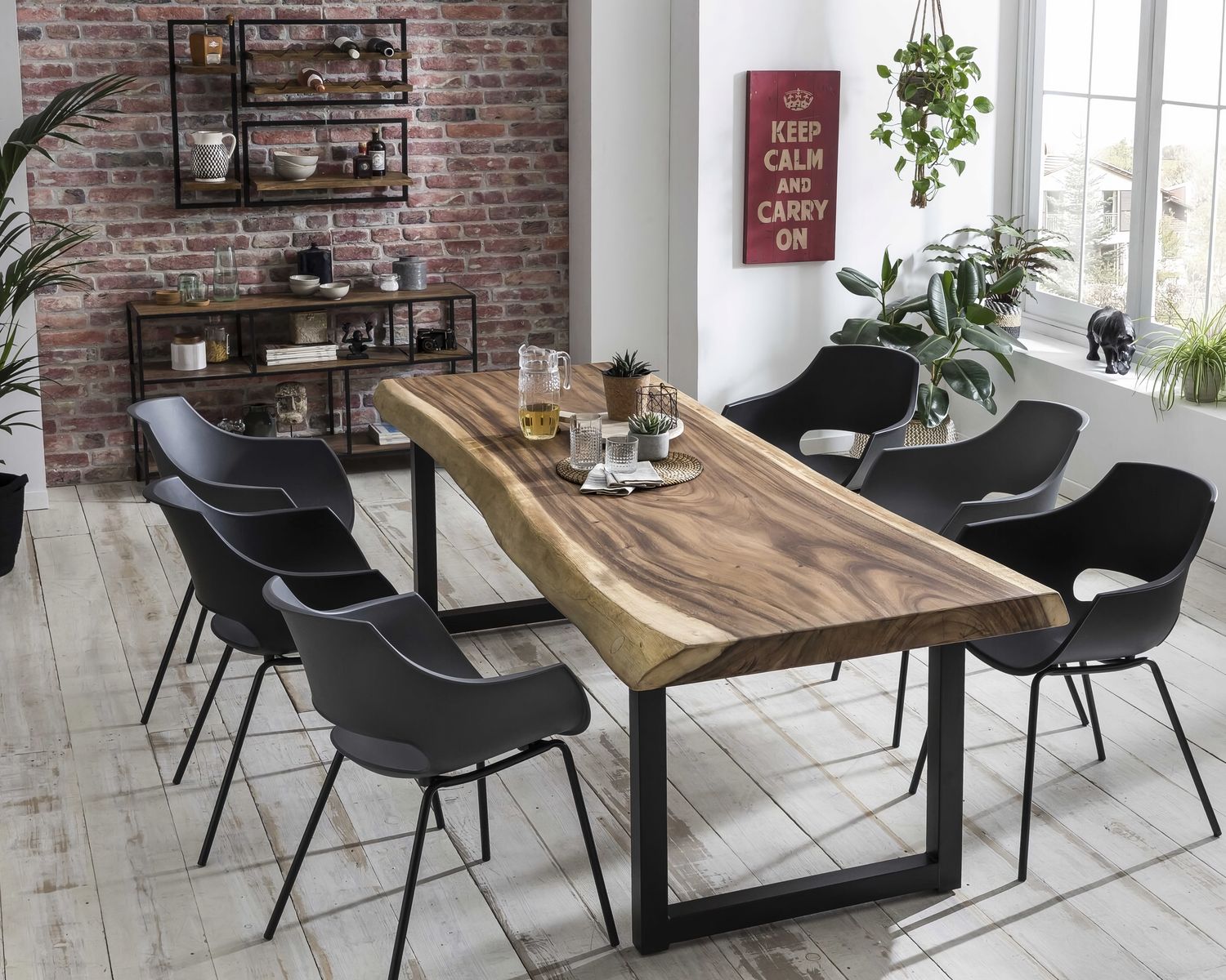 Hier sind Sie genau richtig, wenn Sie einen Tisch mit Charakter möchten. Mit der Suarholz Tischplatte, der Baumkante wie gewachsen und dem Gestell in Stahl antikschwarz lackiert wird der Essplatz zum absoluten Eye-Catcher!